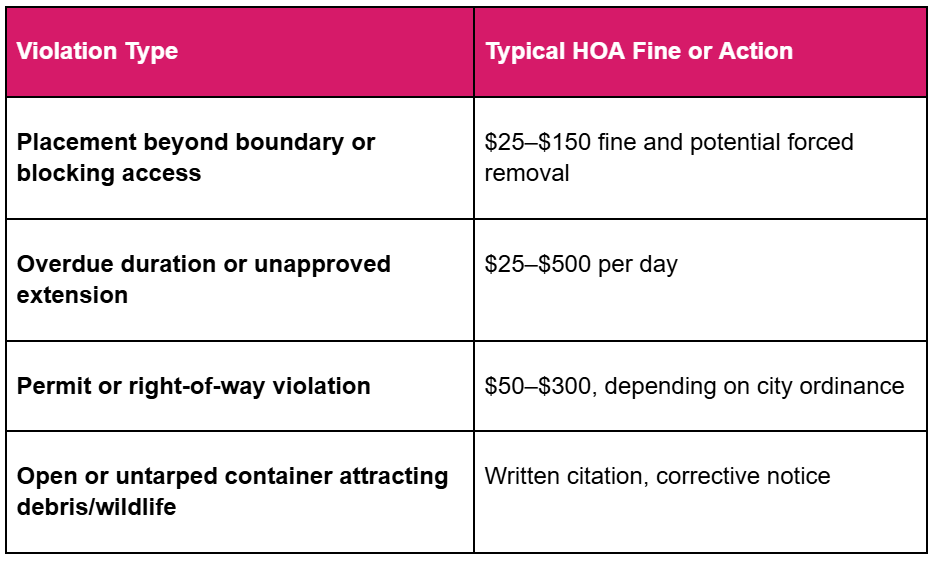 Delivery and pickup windows often align with quiet-hour schedules. Early-morning drop-offs or late-night hauls can generate complaints or citations. In many communities, the standard rental window runs seven to ten days for typical cleanouts, with longer spans requiring board approval. Violations can bring daily fines ranging from $25 to $500; in larger metros, progressive penalties may climb to $250 or more if the container remains after notice. Leaving containers open attracts wildlife or debris, another frequent reason for citations.